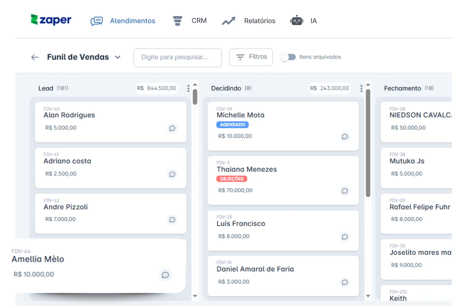 Tenha funis de vendas baseado nas conversas geradas por leads e clientes.