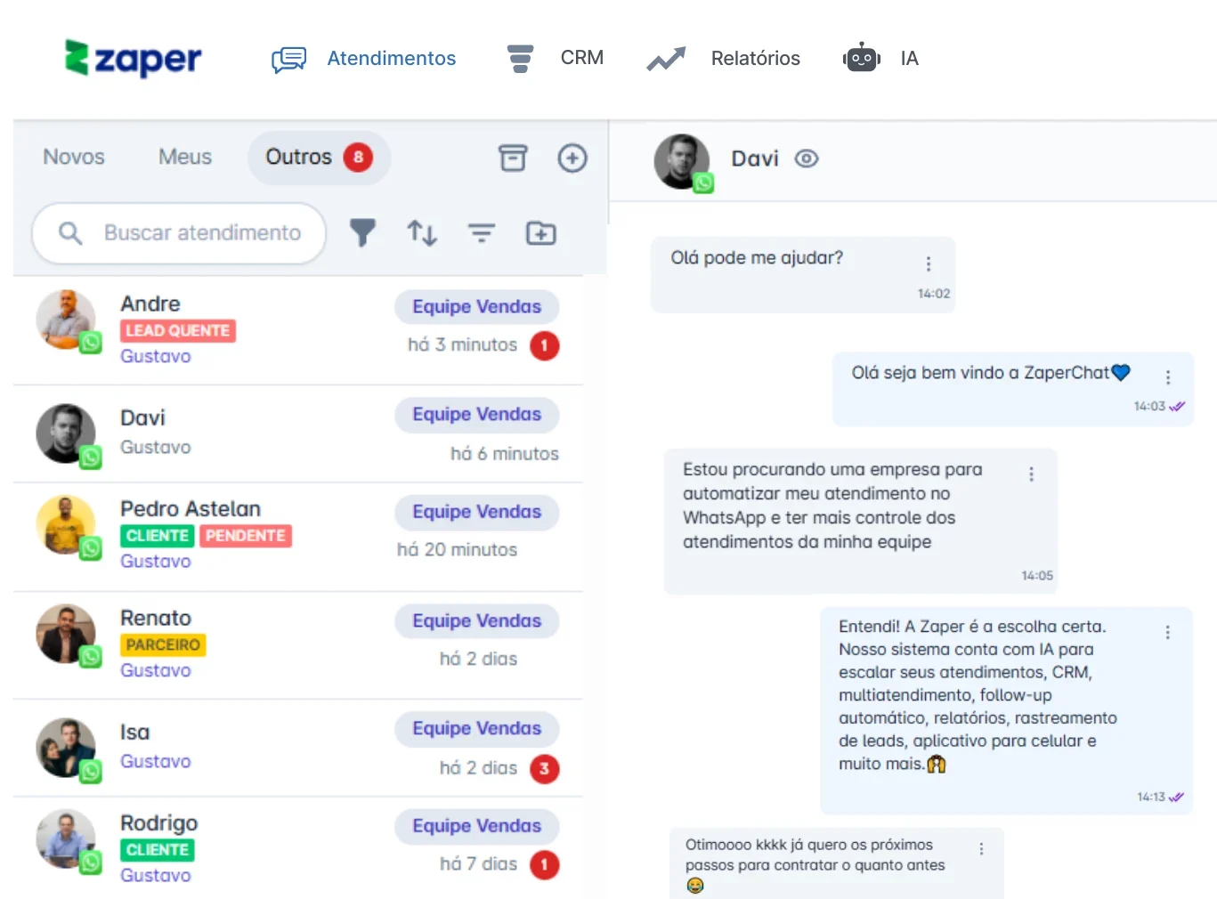 A Zaper IA realiza follow-ups de forma automatizada para retomar conversas.
